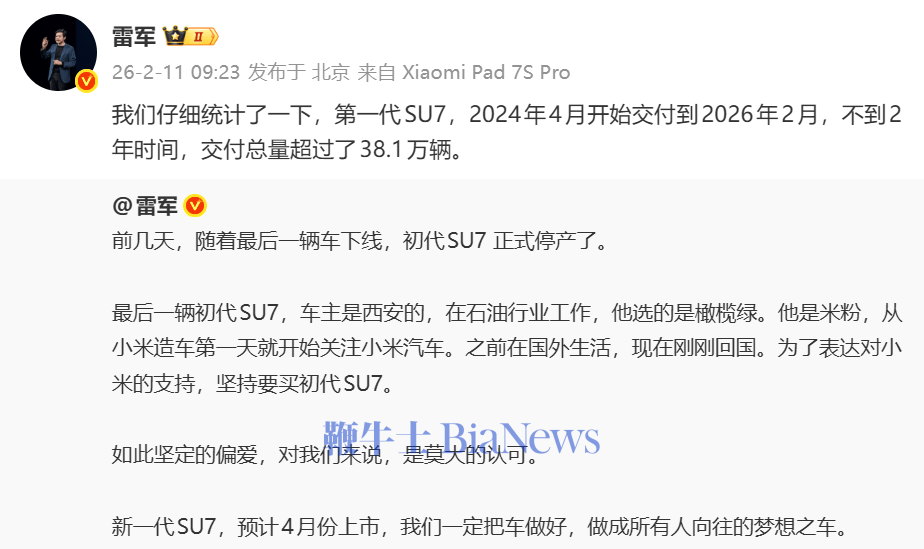 小米汽车旗下首款车型SU7自2024年4月启动交付以来,市场表现持续亮眼。截至2026年2月,这款纯电轿车在不足两年的时间内累计交付量突破38.1万辆,成为新能源汽车市场的一匹黑马。