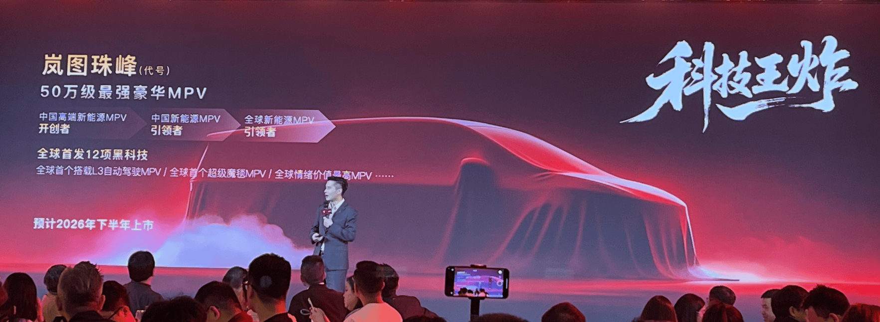 2026年将成为岚图的产品爆发年。全新SUV泰山X8以"大五座"概念切入市场,5200mm的车长配合2025mm车宽,打造出堪比行政级轿车的后排空间,尾厢容积更可满足长途旅行需求。该车型将首发华为新一代交互座舱和L3级智驾硬件,计划上半年正式上市。在高端MPV领域,代号"珠峰"的旗舰车型将价格带突破至50万元以上,搭载包括L3级自动驾驶、超级魔毯底盘在内的12项黑科技,重新定义豪华出行标准。更引人注目的是与华为乾崑联合开发的轿跑SUV,这款被内部称为"叛逆之作"的车型,以小米YU7为对标对象,融合华为最新智驾系统与岚图底盘调校技术,试图在操控性能领域建立差异化优势。