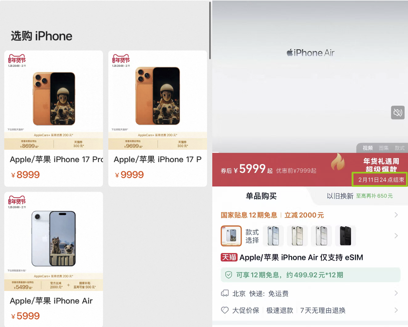 目前天猫年货节针对iPhone 17系列的优惠并不多,只有iPhone 17系列领券立减300元、iPhone Air叠加惊喜券、国补至高立减2500元,标准版iPhone 17并没有任何优惠。关键是这些优惠只截至2月11日24点,超过截止日期后就不能使用优惠了,而且春节期间还不发货。