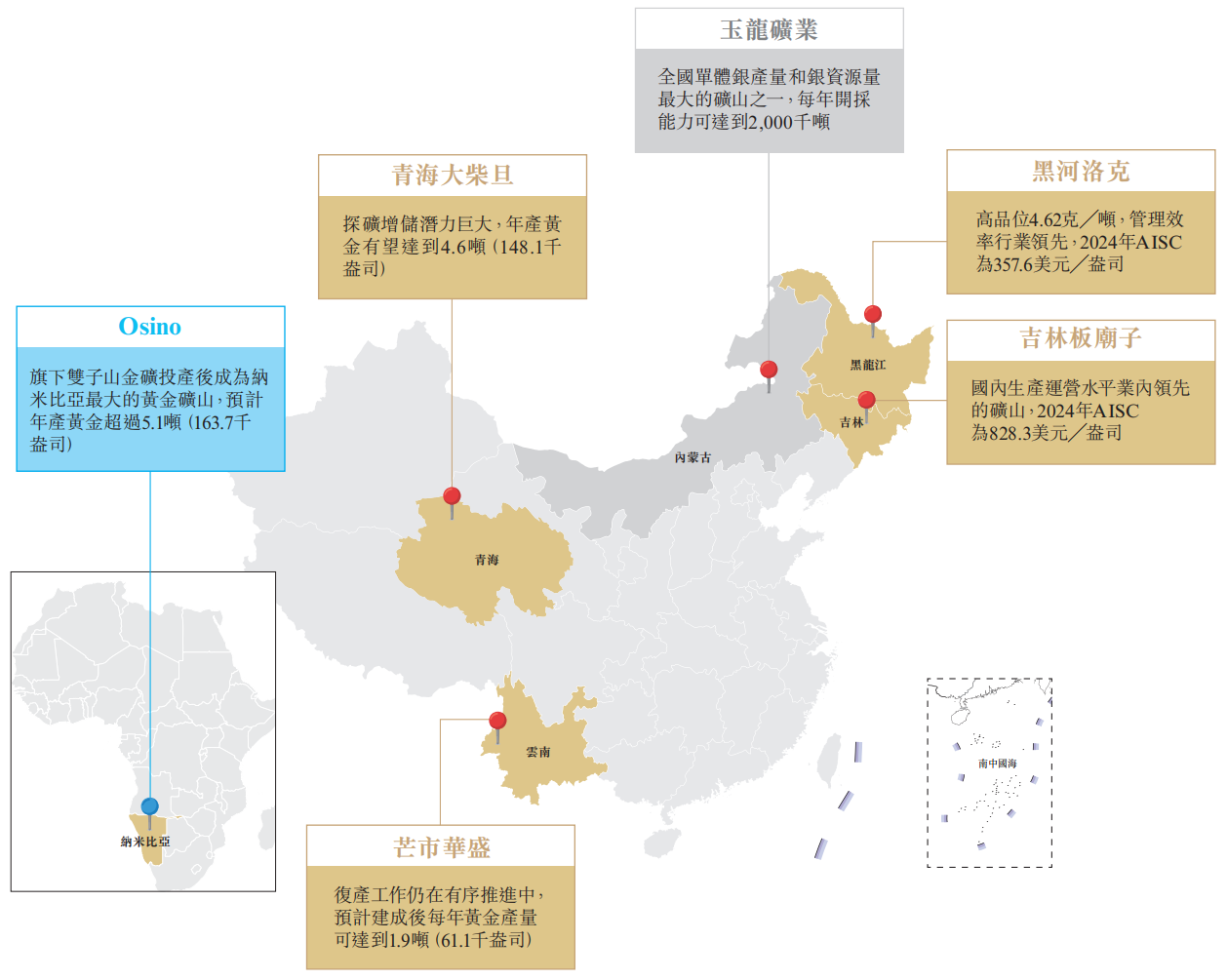 目前,山金国际旗下运营6家矿业企业,分布在中国黑龙江、吉林白山、青海海西州、内蒙古西乌珠穆沁旗、云南以及非洲纳米比亚。其中,5家金矿企业持有6个采矿许可证、29个探矿许可证,另有4个探矿许可证处于待申请状态;1家多金属矿企业则拥有3个采矿许可证和6个探矿许可证。截至2025年6月30日,公司黄金资源量达284.6吨(约915.1万盎司),较2023年底的146.7吨(471.5万盎司)增长近一倍。