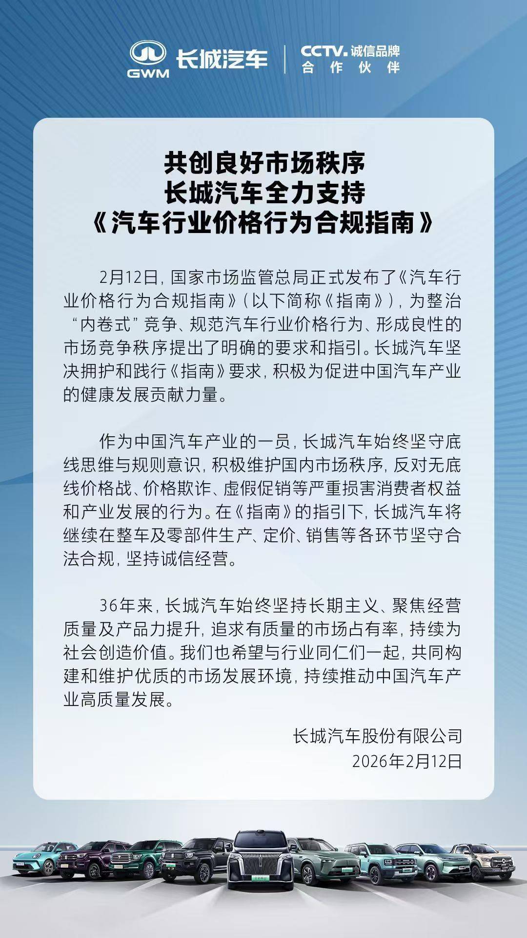 长城汽车率先响应《指南》要求,于今日晚间发布声明表示,将全面支持并严格遵循《指南》规定,坚持长期主义发展理念,在整车及零部件生产、定价、销售等全链条环节坚守合法合规底线。企业强调,反对任何形式的无底线价格战、价格欺诈及虚假促销行为,呼吁全行业携手维护市场秩序,共同推动中国汽车产业向高质量发展阶段迈进。