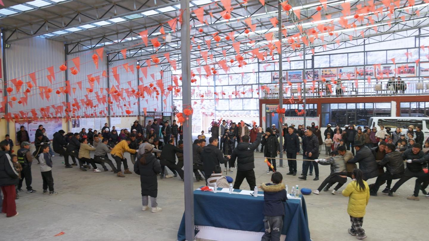 拔河比赛现场呐喊震天、气氛高涨,十五人一组的混合代表队齐心协力、奋勇比拼;击鼓传花区域欢声笑语、趣味盎然,接到花束的村民即兴献唱民歌,尽显淳朴风采;套圈游戏前排起长长队伍,孩子们目光专注、跃跃欲试,期盼收获心仪奖品。活动现场还专门设置临时全家福拍摄点,为前期未能参与拍摄的家庭定格团圆瞬间,留存新春美好记忆。