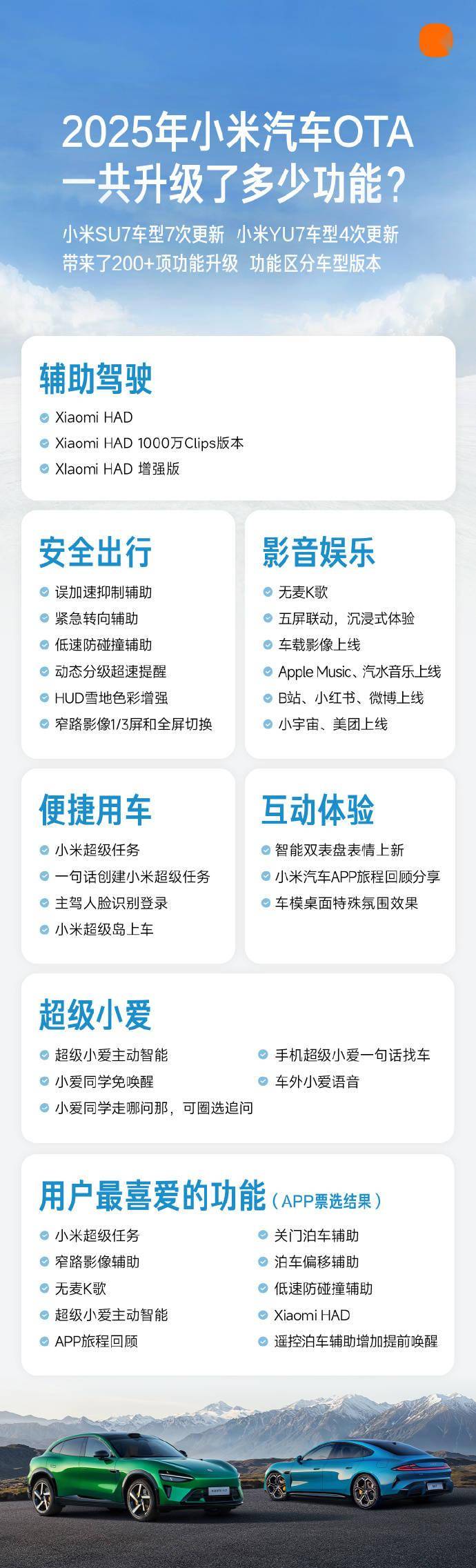 小米汽车近日对外披露了其车型功能更新的详细数据。2025年,小米SU7车型累计完成7次系统更新,小米YU7车型则进行了4次迭代,两大车型合计新增超过200项功能,覆盖辅助驾驶、安全出行、智能交互等多个领域。