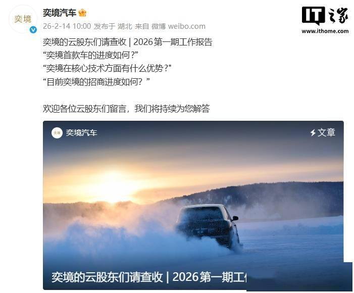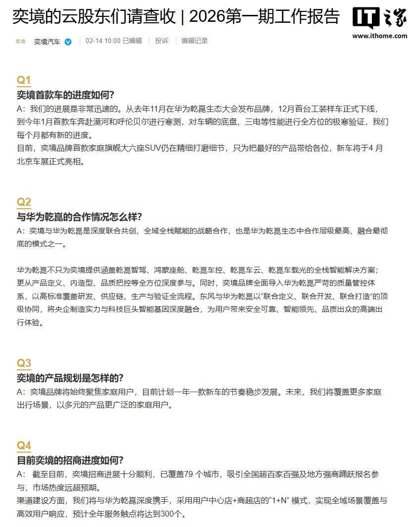近日,奕境汽车通过官方渠道向其“云股东”发布了2026年首期工作进展报告,详细披露了品牌首款车型的研发动态、与华为乾崑的战略合作细节、产品布局规划以及渠道建设成果。