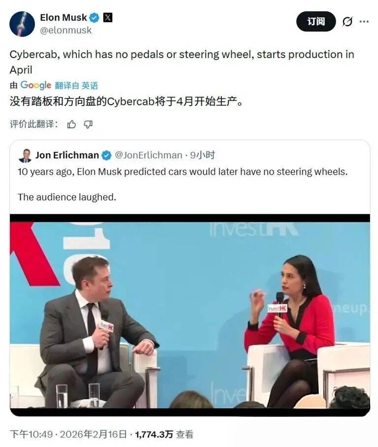 回顾马斯克对Cybercab生产计划的公开表态,可以发现其时间表的一致性。2025年12月,他首次透露“真正的产能爬坡将从2026年4月开始”;今年1月23日,他进一步宣布“Cybercab将于4月投产”;而此次2月16日的表态,则是他半年内第三次重申这一时间节点。如此高频的承诺,在特斯拉的历史上并不常见。