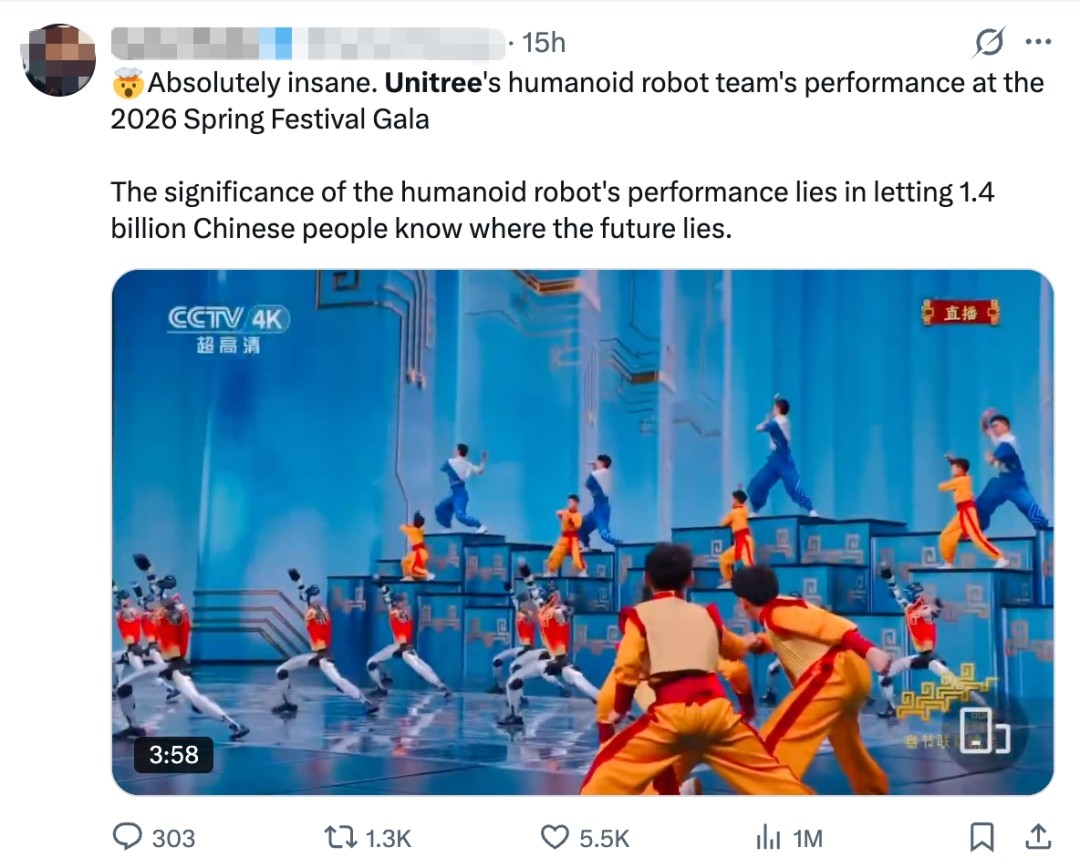这场名为《武BOT》的机器人武术大秀,迅速从国内火到海外。在社交媒体X上,一条条视频切片动辄赢得上百万预览量、数千次点赞转发以及数百条评论。这些博主赞叹“短短一年内,他们就从机器人进化成了‘人类’”,“简直太疯狂了……其意义在于让14亿中国人了解未来在哪里”。