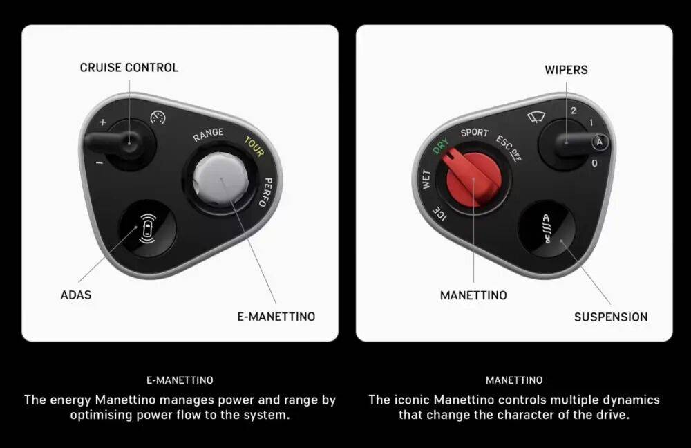 人机交互界面以“触感、清晰、直觉”为核心,团队优先采用实体按键以增强驾驶者与车辆的互动感。方向盘采用简化三幅结构,灵感源自20世纪50-60年代的木质Nardi方向盘,整体分为两个控制模块,类似F1赛车设计,重量较标准法拉利方向盘减轻400克。中控屏幕配备球形转轴,可自由调整角度以适应驾驶员或副驾驶需求,并配有掌托支持免低头操作。右侧球形多功能表可切换时钟、计时器、指南针及弹射起步指南等功能;顶部左侧屏幕显示时速、功率等关键参数,中部大屏则整合CarPlay、空调及车辆设置信息。