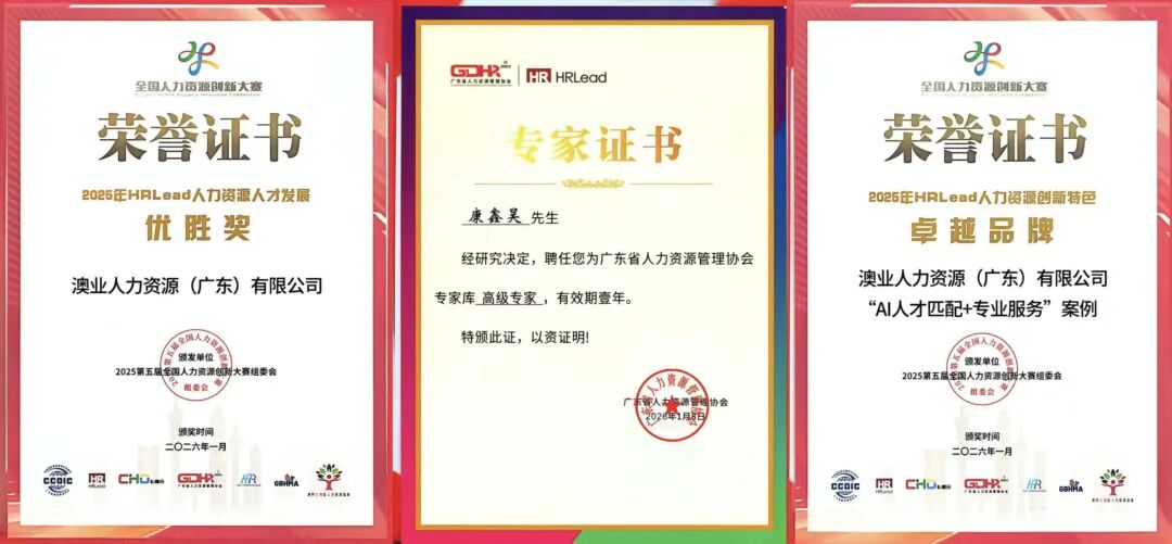 作为人力资源服务行业的践行者与创新者,澳业人力始终坚守“赋能人才成长、助力企业发展、服务湾区建设”的初心,积极参与区域人才建设,推动校企深度融合,先后参与多场校园招聘会,为大湾区发展输送并赋能优秀人才。与此同时,荣耀再添一笔——我司创始人康鑫昊先生凭借深厚的行业造诣、丰富的实践经验,被正式聘任为广东省人力资源管理协会专家库高级专家,这既是对康鑫昊先生个人专业能力的高度认可,更是行业对澳业人力在人力资源领域专业水准与行业影响力的又一有力佐证。此次大赛中的亮眼表现,正是公司多年来专业积累、服务升级、品牌沉淀的集中体现