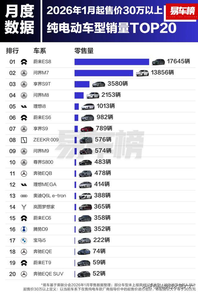 最新行业数据显示,今年1月30万元以上纯电车型销量排行榜中,蔚来ES8以超1.7万辆的成绩登顶,不仅成为当月最畅销的大型SUV,更在30万元以上全品类车型(含燃油车与新能源车)中占据榜首。作为全系纯电的品牌,蔚来ES8的夺冠进一步印证了高端纯电市场的增长潜力。问界M7则以2.6万辆的总销量紧随其后,其中纯电版贡献1.3万辆,与增程版销量基本持平,展现出双动力路线并行的市场适应性。