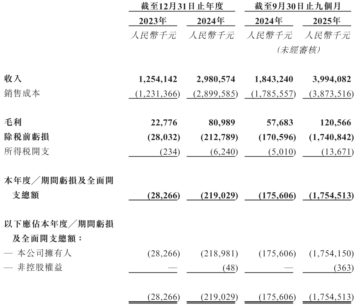 财务数据显示,粤十数智近年营收呈现快速增长态势:2023年实现收入12.54亿元,2024年增至29.81亿元;2025年前9个月营收已达39.94亿元,较上年同期的18.43亿元增长超一倍。不过,企业仍处于亏损阶段,2023年、2024年及2025年前9个月分别录得亏损2827万元、2.19亿元和17.55亿元,同期毛利分别为2278万元、8099万元和1.21亿元。