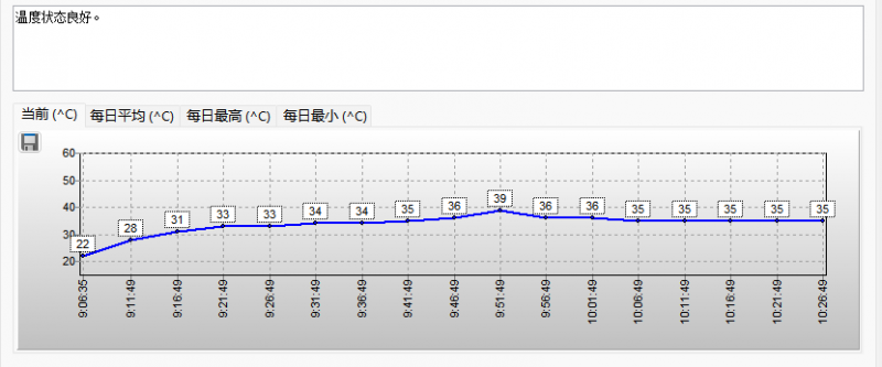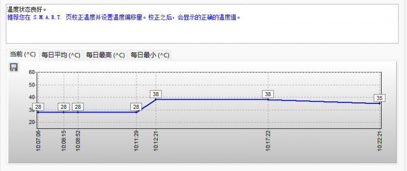 闪迪E81待机温度22℃,初期升温较快,最高温39℃,测试后回落至35℃,随后趋于平稳。