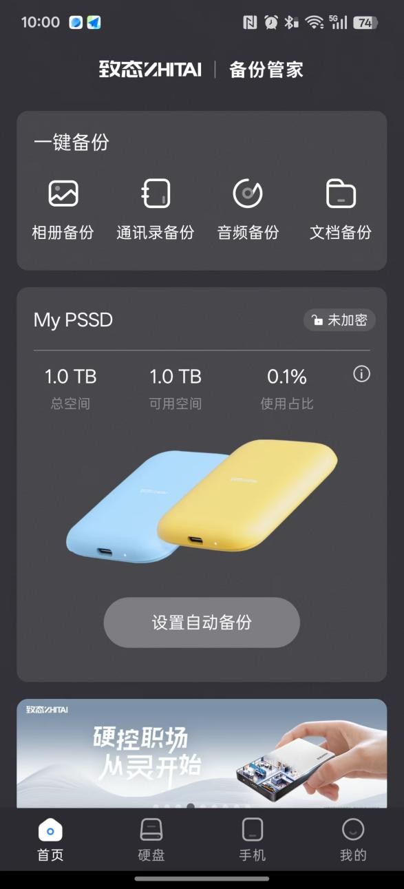 手机端的致态备份管家支持照片、视频、文档、音频的一键备份,还能设置自动备份。