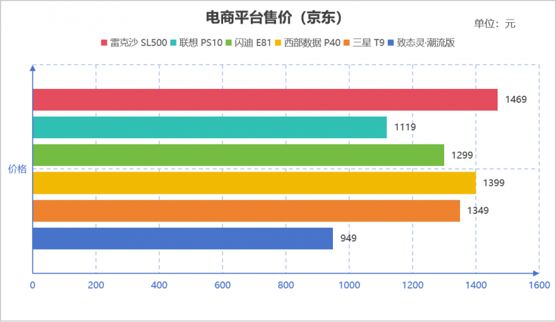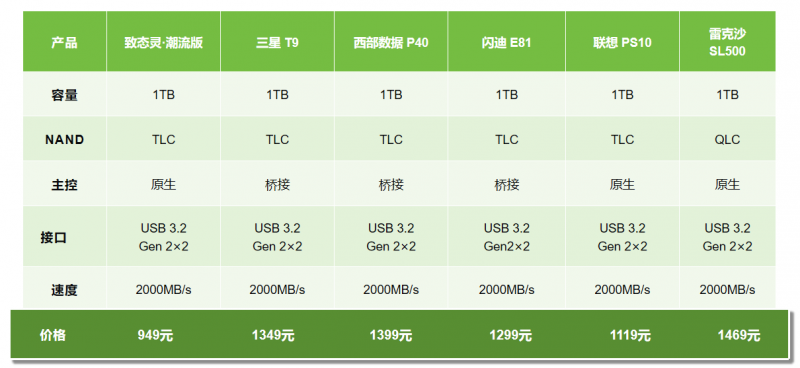 为了回答这个问题,这次我选了6款定位旗舰、容量同为1TB的主流移动固态硬盘横评测试,分别是:致态灵·潮流版、三星T9、西部数据P40、闪迪E81、雷克沙SL500和联想PS10。