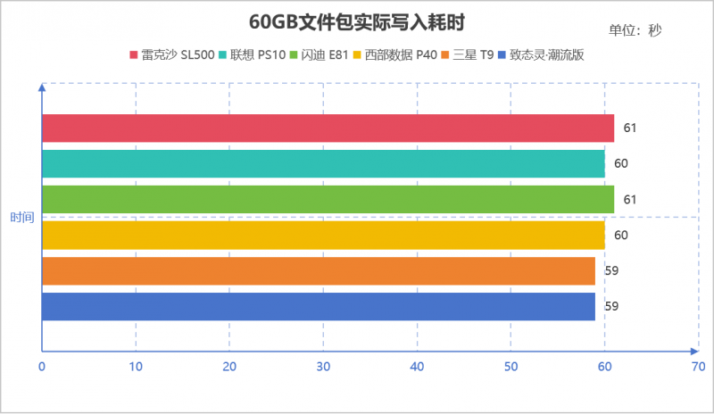 中大型文件选取60GB的图片+视频包,6款产品的传输表现依旧比较均衡,均能在1分钟左右完成传输,差距控制在2秒以内。