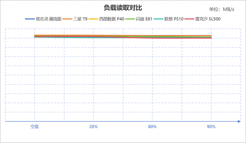 读取性能上,全系表现整体稳健,从空盘到 90% 高负载均无明显衰减,致态灵・潮流版、三星 T9、闪迪 E81的读取速度近乎无波动,其余三款轻微回落。