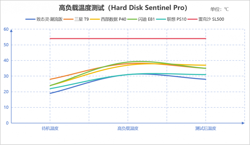雷克沙SL500的高温是极致轻薄的必然取舍,40.7g的超轻重量和7.8mm的超薄机身,让其散热空间被大幅压缩,测试中最高温飙升至54℃,软件直接触发高温告警。
