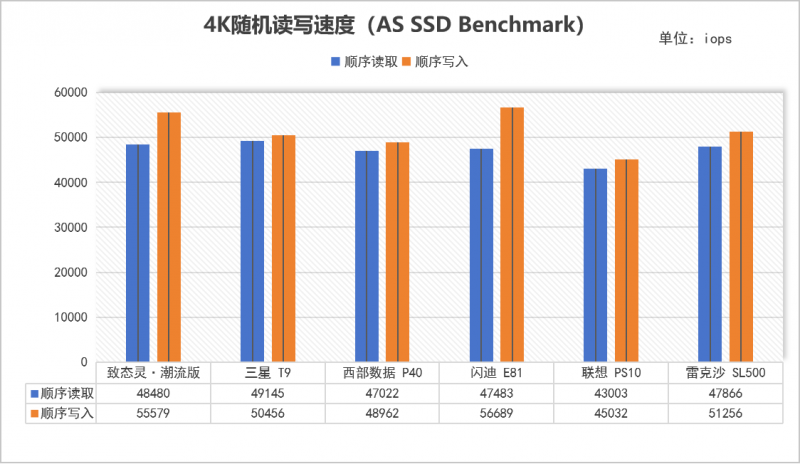 在AS SSD Benchmark测试中,致态灵·潮流版4K-64Thrd读取48480IOPS、写入55579IOPS,多任务并发的高负载场景下表现优异,读取与三星T9同属第一梯队;写入位居第二,与闪迪E81的差距不大,联想此轮表现不甚理想,其余产品稍有落后。