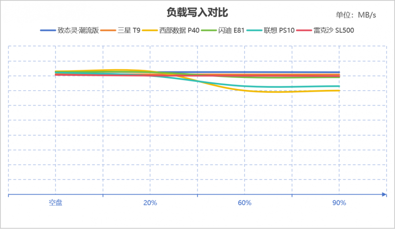 写入性能环节出现分化,致态灵・潮流版、三星 T9、闪迪 E81 基本稳速,西部数据P40 从 60% 负载开始写入下滑,联想 PS10与雷克沙SL500也出现一定下滑。