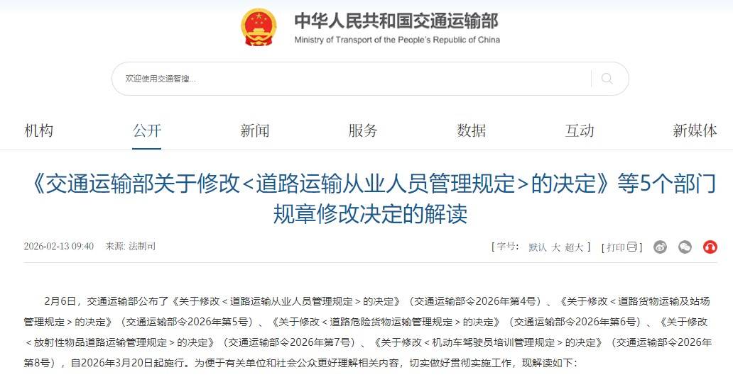 此次修订后的《道路运输从业人员管理规定》将于2026年3月20日起正式施行。交通运输部表示,将根据新规定对相关管理文件进行相应调整,并要求各地交通运输主管部门做好宣传解读和实施准备工作,确保新规定平稳有序落地。