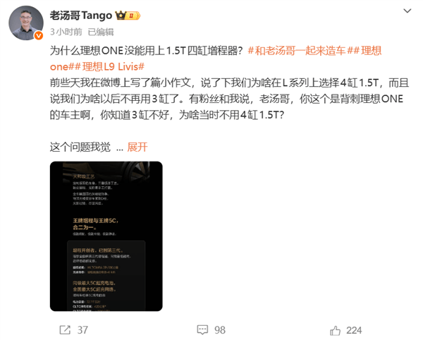 理想汽车产品线负责人“@ 老汤哥”近日通过社交平台发文,详细阐述了理想ONE未采用1.5T四缸增程器的技术背景与决策逻辑。他坦言,这一选择并非主观意愿,而是受限于当时市场环境与技术条件下的最优解。