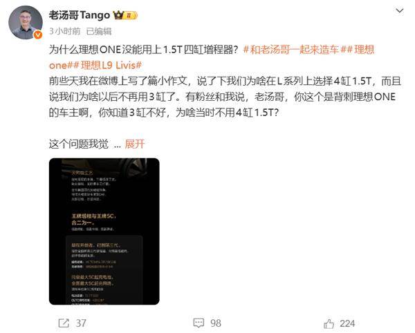 理想汽车产品线负责人“@老汤哥”近日通过社交平台发文,就理想ONE车型未采用1.5T四缸增程器的技术选择作出详细说明。他坦言,这一决策并非主观意愿,而是受限于2017年增程技术市场的发展现状。