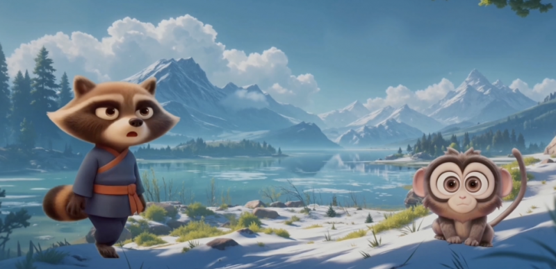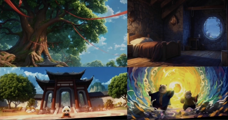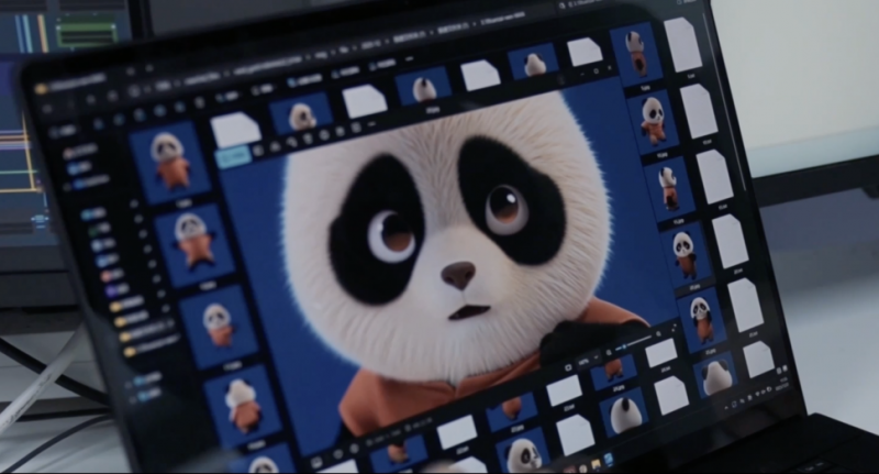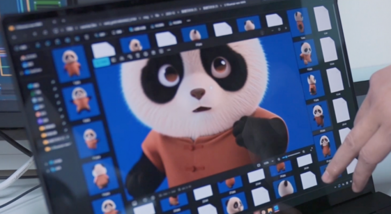 《团圆令》的角色阵容丰富,除了熊猫兄妹,还有小浣熊一火、水獭汤汤、毕婆婆、乌鸦大叔等,故事的场景也十分多元,金木水火土五族各有不同布局,这些在传统手绘模式下往往需耗时数年,但在华硕ProArt 创16的强大AI 算力支撑下,30秒能生成20套角色方案,4K超高清水墨场景每分钟12帧自动渲染,连熊猫的毛发都能动态模拟,效率直接提升80%。