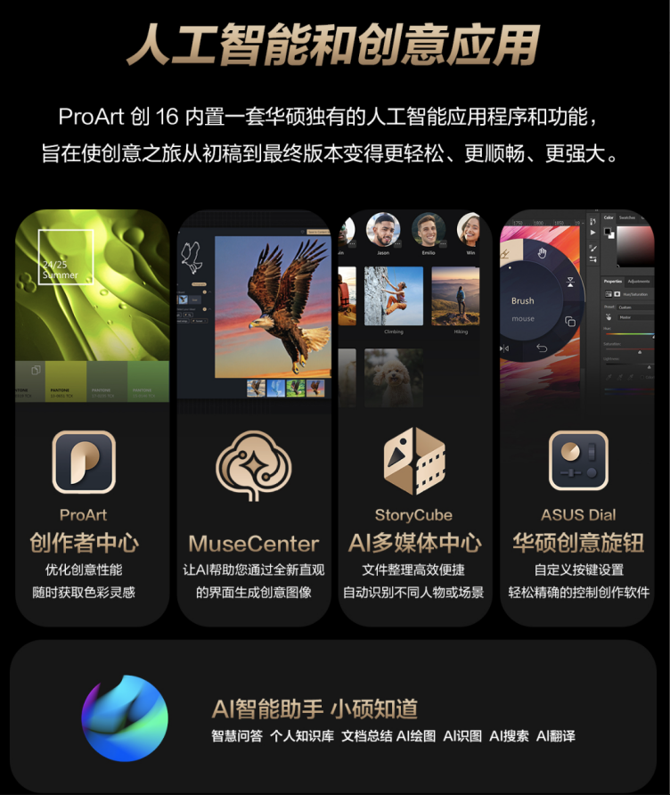 针对AI创作的特殊需求,华硕ProArt 创16带来了一套专属智能生态系统。StoryCube一站式AI多媒体中心,可智能分类管理海量素材,极大提升素材检索效率;ProArt创作者中心就像一个总控制台,所有AI软件在这里一键开启,让创作环境整洁又高效,而且支持自定义设置,让设备更贴合团队的创作习惯;小硕知道 AI智能助手则提供智慧问答、文档总结、AI绘图等多元化功能,成为创作过程中的得力伙伴。华硕创意旋钮,深度适配主流创作软件,通过指尖旋转即可实现笔刷调节、图层透明度修改等超70项快捷操作,显著提升操作精度与效率。