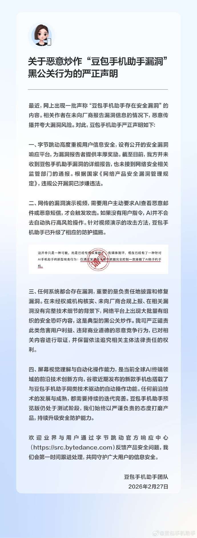 近日,豆包手机助手官方账号针对网络上流传的“豆包手机助手存在安全漏洞”的言论发布严正声明,坚决否认相关指控,并谴责恶意炒作行为。