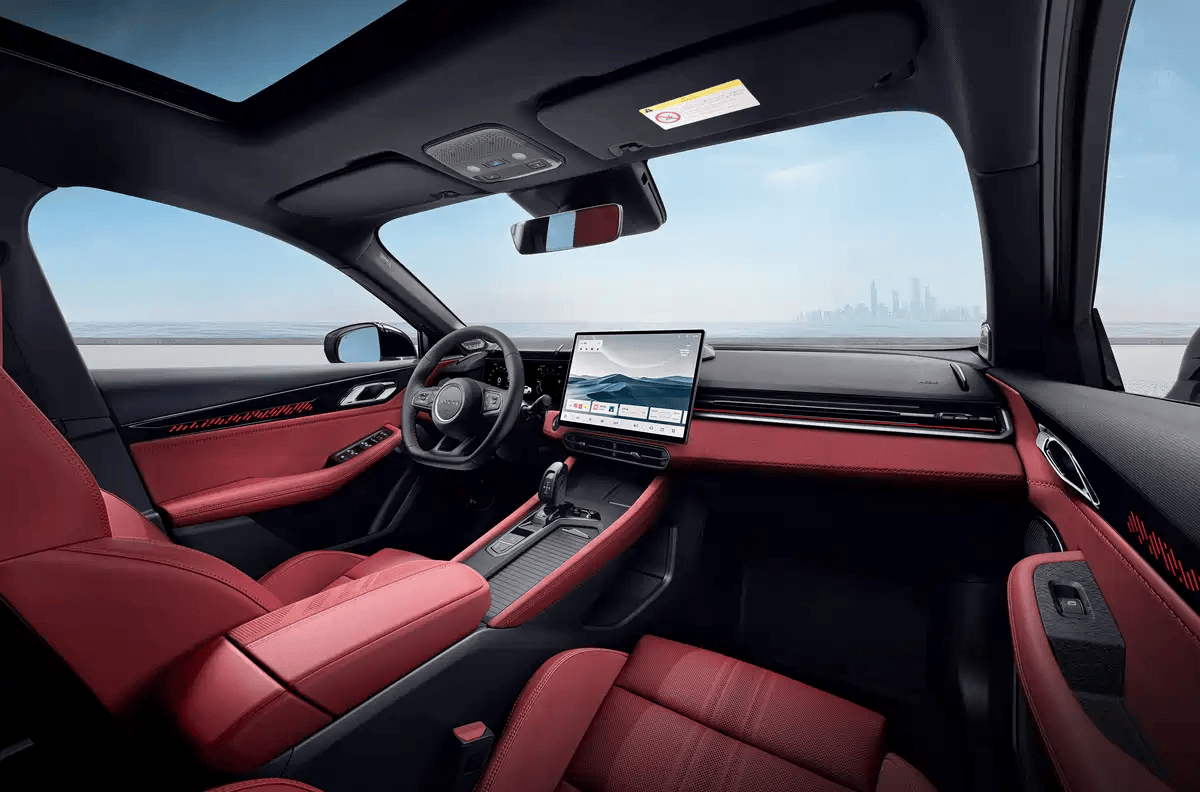 内饰设计上,新车采用了炽热红主题,营造出如同赛道残影在座舱内流动的视觉效果。车内配备三辐式平底运动方向盘、全液晶仪表盘以及中控多媒体大屏,科技感与运动感并存。中控通道区域还升级为电子换挡杆,进一步提升了操作便捷性。