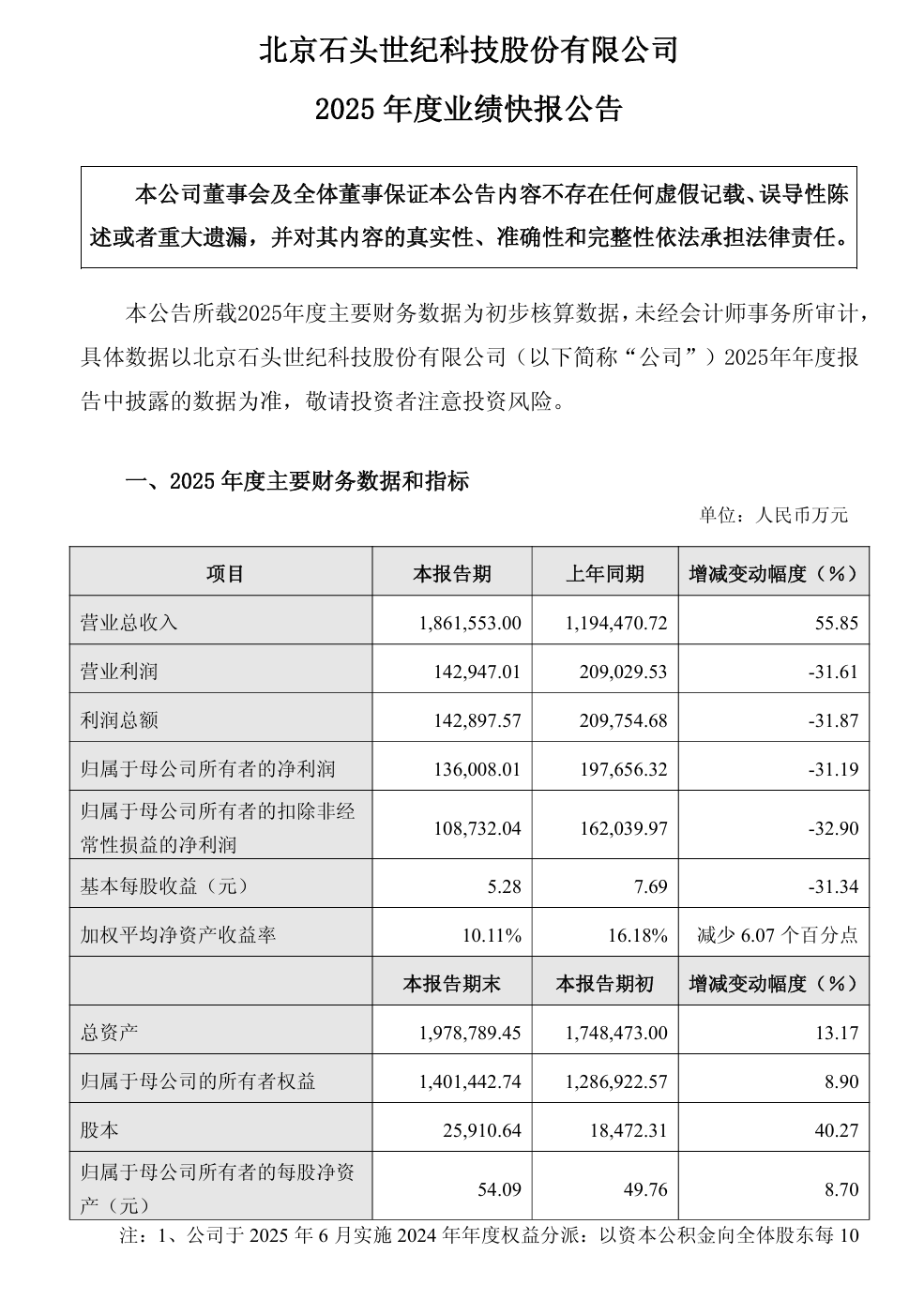 石头科技近日披露2025年度业绩快报,数据显示公司全年营业总收入达186.16亿元,较上年同期增长55.85%,展现出强劲的市场扩张态势。然而,归属于母公司所有者的净利润为13.60亿元,同比下滑31.19%,基本每股收益5.28元。这一“增收不增利”的现象引发市场关注。