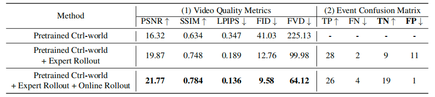 1. 经过真实试错数据微调后的世界模型,在 PSNR、SSIM 等视频质量指标上,全面超过了原始预训练模型,以及仅用专家成功数据微调的模型,生成的视频画面更贴合真实;