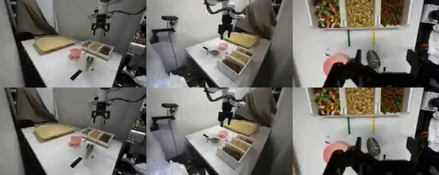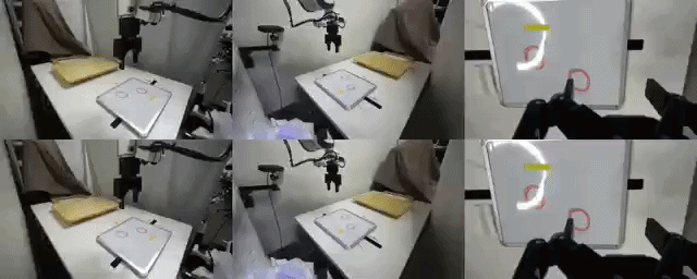 比如舀花生入碗、用纸巾擦白板标记这类需要精准物理交互的任务,预训练的世界模型完全抓不住细节,仅用专家数据微调的模型则过于乐观,而经 VLAW 校准的世界模型,能精准捕捉底层的物理动力学,生成的结果和真实世界高度吻合。