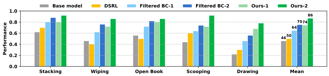 与基线方法的成功率提升对比。进行了两轮迭代训练,「Ours-1」表示 VLAW 方法经过第一轮在线 rollout 后的结果。总体而言,在多任务设置下 VLAW 持续优于 Filtered BC 和 DSRL 基线