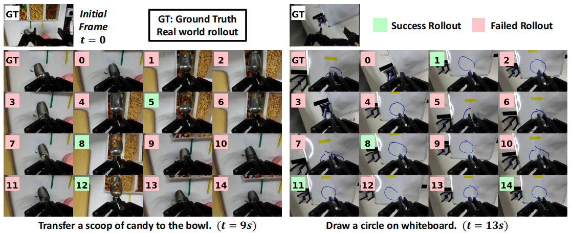 GT 代表真实世界的 rollout,0~14 代表世界模型生成的多种想象轨迹,所有轨迹均从相同的 GT 初始帧出发并使用 π0.5 策略。在真实世界 rollout 中,机器人未能抓住勺子(左,GT)且未能画出完整的圆(右,GT)。借助世界模型,我们能为这些失败案例找到成功的轨迹,这对策略学习具有重要意义
