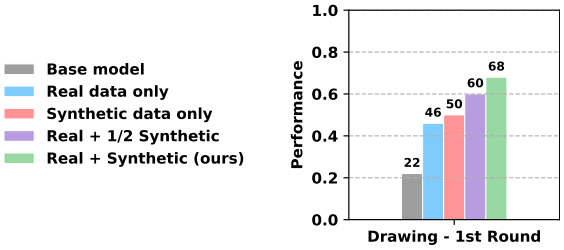 消融实验研究了 (1) 用于策略微调的合成数据量(从 500 条减少到 250 条)和 (2) 微调时是否包含真实世界 rollout 数据(50 条)。实验发现,减少合成轨迹数量或移除真实世界数据集都会导致性能下降