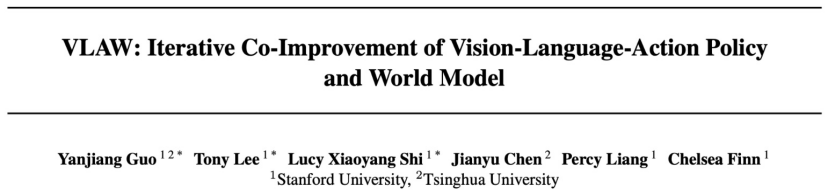 清华陈建宇(星动纪元创始人)团队和斯坦福 Chelsea Finn(PI 创始人) 团队基于 Ctrl-World (两个团队的首个合作成果),再度携手,联合提出了 VLAW 框架,首次实现了 VLA 策略与动作条件世界模型的协同迭代优化,让两者形成一个「互相促进的闭环」: