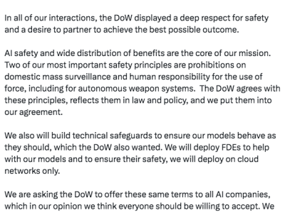 OpenAI奥特曼:与美国国防部达成协议 将我们的模型部署到他们的机密网络中