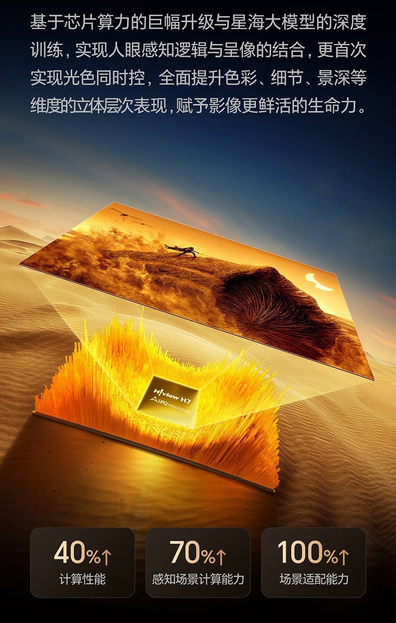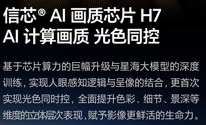 这正是海信信芯®AI画质芯片 H7 展现其战略价值之处。作为全球首颗光色同控AI画质芯片,它首次解决了行业级难题:当背光从黑白变成彩色,如何让芯片理解并同步控制“光的亮度”与“色的纯度”?