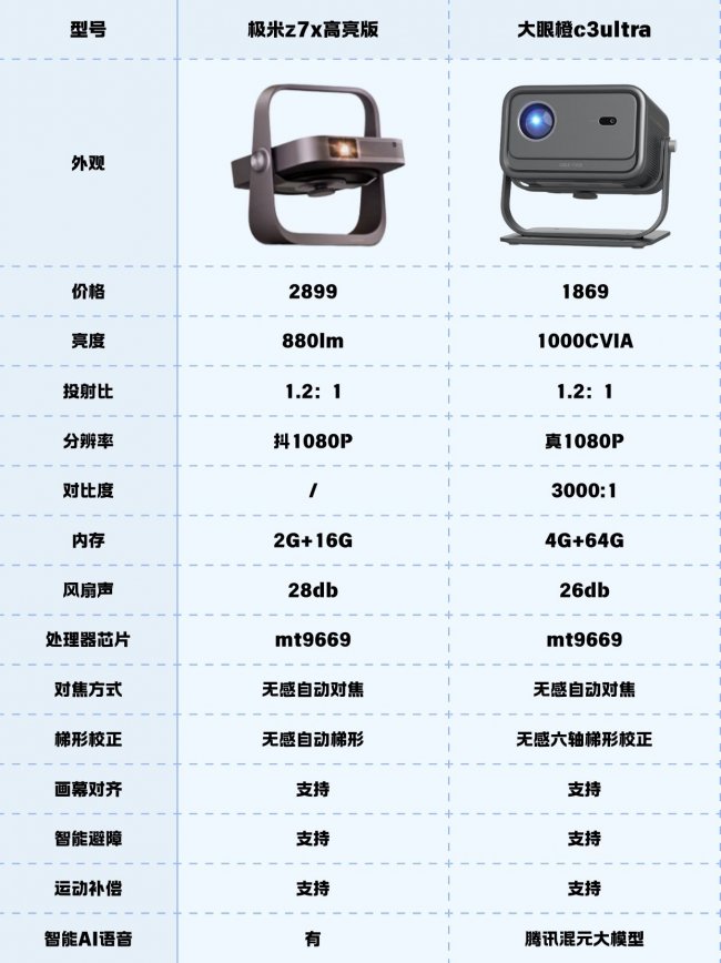 总体来说,大眼橙C3 Ultra在亮度、刷新率、技术先进性、功能创新性和性价比方面都表现出色,特别是120Hz高刷屏、MT9669旗舰芯片以及4GB+64GB大存储,使其成为了更有质价比的选择,而极米Z7X高亮版则在便携性上比较有优势。