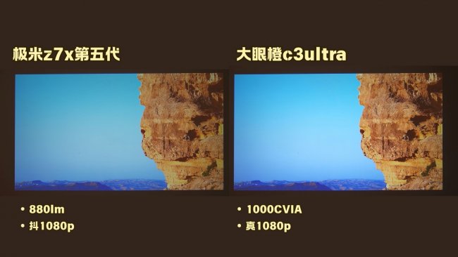 而极米Z7X高亮版亮度为880lm流明。在实际体验中,极米Z7X高亮版对环境亮度的抗光性会没有大眼橙c3ultra强,更适合在弱光环境下使用,画面效果会更好,色彩会更饱满。