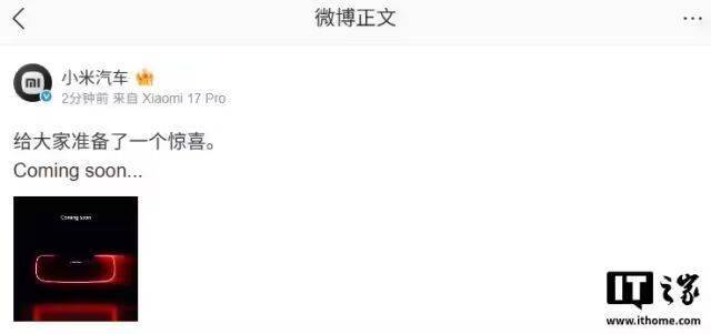 小米汽车即将带来新动作!今日,小米汽车官方发布预告:“给大家准备了一个惊喜。Coming soon...”,随后雷军转发该消息并配文“明天见”,引发外界对小米汽车新动态的强烈关注。