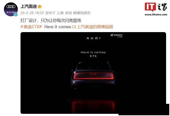 上汽奥迪近日正式发布了全新纯电SUV——AUDI E7X的预热信息,宣传语“灯厂设计,只为让你每次闪亮登场”凸显了其灯光技术的核心卖点。官方同步展示了矩形尾灯点亮后的动态效果,科技感与辨识度兼具,引发市场关注。