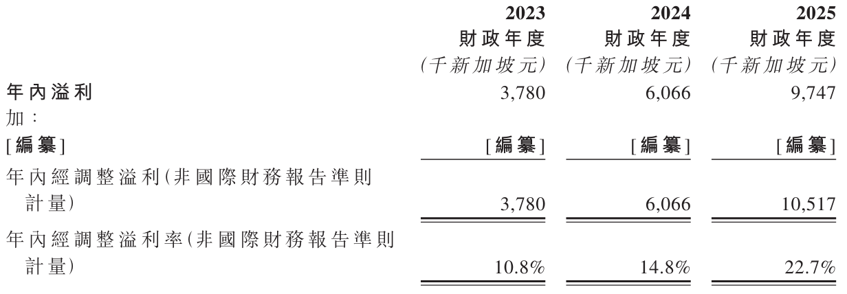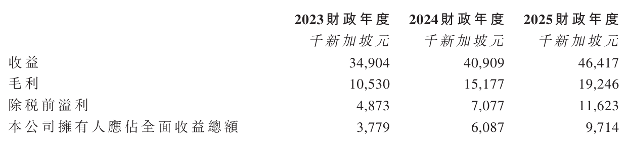 财务数据显示,企业盈利能力随规模扩张持续增强。2023年至2025年间,毛利从1053万新加坡元提升至1924.6万新加坡元,增幅达82.8%。经调整净利润表现更为突出,同期数据分别为378万、607万和1052万新加坡元,2025年较2023年增长近178%。公司拥有人应占收益总额同样保持上升趋势,三年间从378万新加坡元增至971万新加坡元。