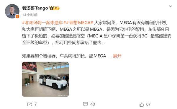 理想汽车产品线负责人汤靖近日通过社交平台明确表示,理想MEGA将不会推出增程式版本车型。这一决定源于该车型独特的纯电架构设计——为最大化舱内空间,工程师将车头碰撞溃缩区压缩至极短范围,使其成为中保研历史上首款获得3G+最高安全评级的MPV车型。汤靖强调,若增加增程器,车头长度必然增加,这将彻底改变MEGA的设计初衷。