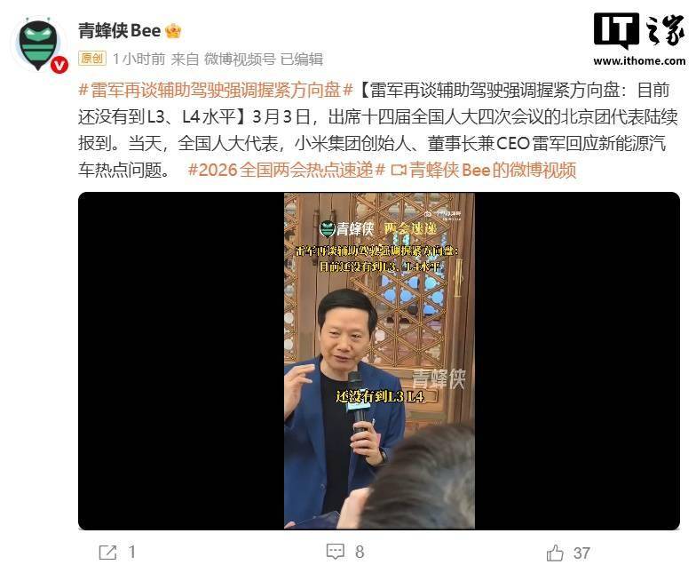 全国人大代表、小米集团创始人雷军在接受采访时,就新能源汽车领域的技术发展发表了重要观点。他特别强调,当前汽车辅助驾驶技术仍需驾驶员保持高度警惕,双手必须时刻紧握方向盘。