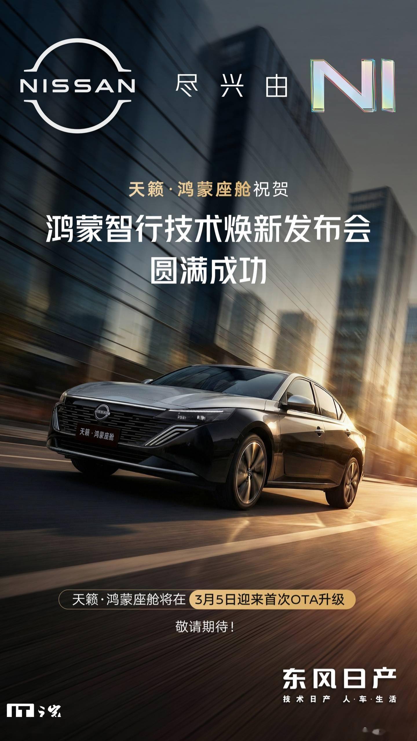 东风日产天籁·鸿蒙座舱即将迎来首次OTA升级。根据官方消息,这款全球首款搭载鸿蒙座舱的燃油车型将于3月5日推送系统更新,此次升级恰逢鸿蒙智行技术焕新发布会后,引发市场对鸿蒙座舱新版本的期待。