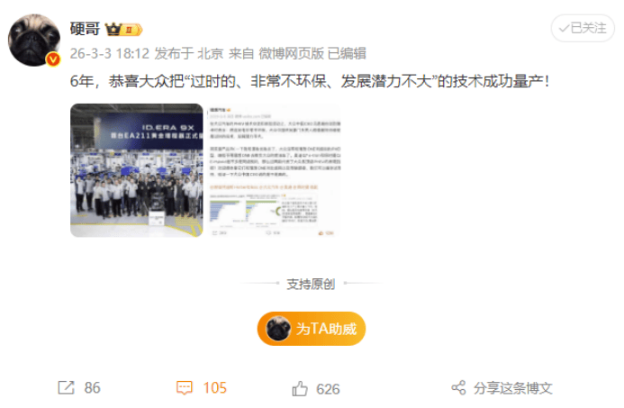 当上汽大众宣布EA211增程器正式下线时,理想汽车官方社交账号的一句“恭喜”,让这场持续六年的技术路线之争画上了耐人寻味的句点。这场看似轻松的互动背后,折射出中国新能源汽车市场从技术争论走向务实融合的深刻转变。