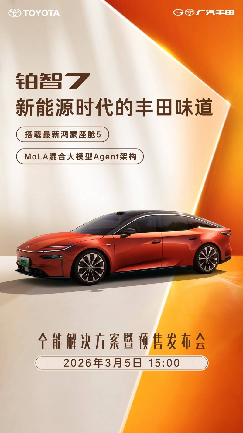 广汽丰田旗下全新纯电车型铂智7即将于3月5日15:00正式启动预售,这款融合了头部科技企业技术优势与传统大厂制造实力的产品,被视为合资品牌在智能化赛道上的重要突破。通过搭载华为鸿蒙座舱5系统与MoLA大模型架构,新车在车机交互、场景适配和生态融合层面实现代际跃升,标志着合资纯电车型正式向新势力发起全面挑战。