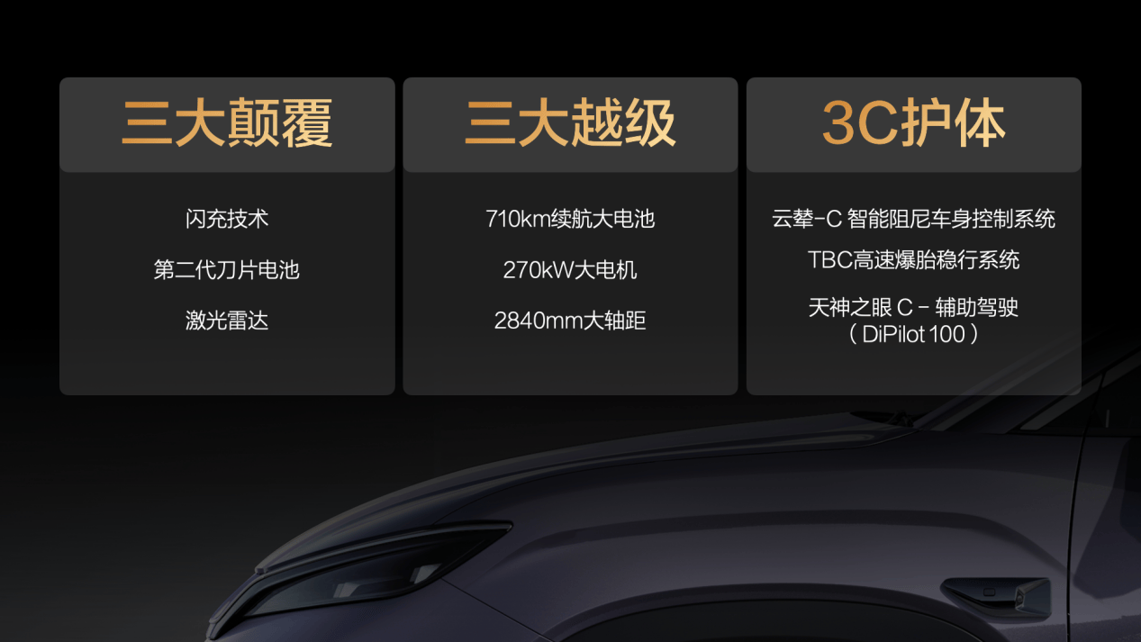 动力系统提供两种后驱单电机版本:低功率版最大功率240kW,高功率版最大功率270kW,最高车速均达210km/h。电池组采用第二代刀片电池技术,提供75.616kWh和82.732kWh两种容量选择,CLTC工况下纯电续航里程分别为605km和710km。底盘配置全系标配云辇-C智能阻尼车身控制系统,搭配前麦弗逊+后五连杆独立悬架,并配备TBC高速爆胎稳行系统,提升行驶稳定性与安全性。车机系统搭载最新DiLink 5.0智能网联系统,支持多场景语音交互、在线娱乐及远程控制功能,物理按键与旋钮的保留则兼顾了操作实用性。