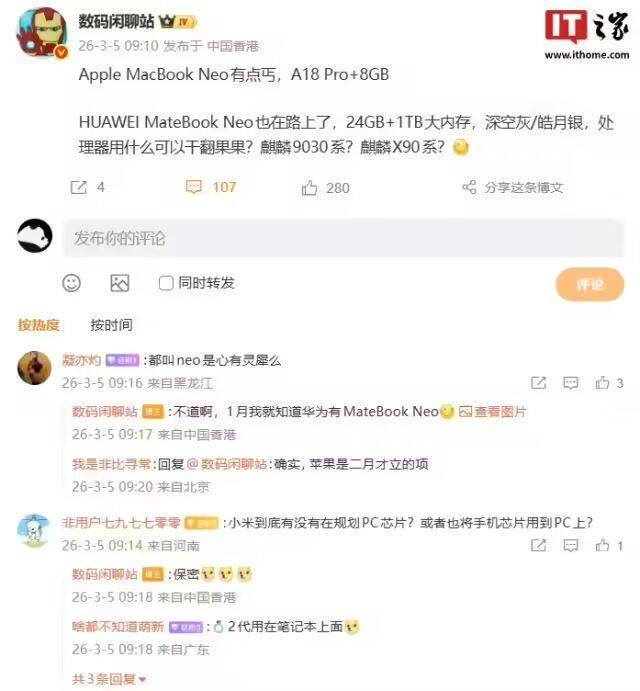 关于核心处理器信息,爆料者并未直接公布具体型号,而是抛出两个可能性选项引发网友讨论——麒麟9030系或麒麟X90系。这种悬念式爆料方式迅速点燃了科技爱好者的讨论热情,相关话题在社交平台持续发酵。值得注意的是,该博主此前曾于1月就提及过华为存在MateBook Neo的研发计划,此次爆料可视为对前期信息的补充确认。